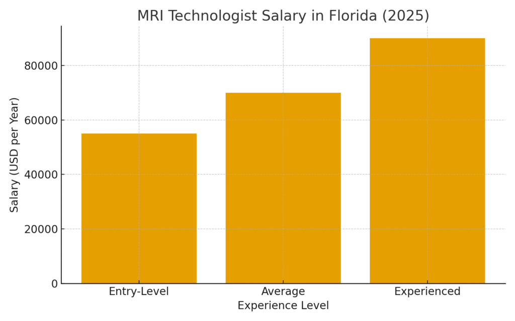• Average Salary : According to 2025 data, the average MRI technologist salary in Florida is around $70,000 per year, with entry-level positions starting at $55,000 and experienced technologists earning up to $90,000 annually.
