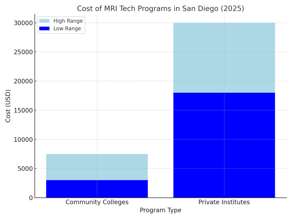 The cost of MRI school in California ranges from $3,000–$7,500 per year at community colleges to $18,000–$30,000 at private institutions.