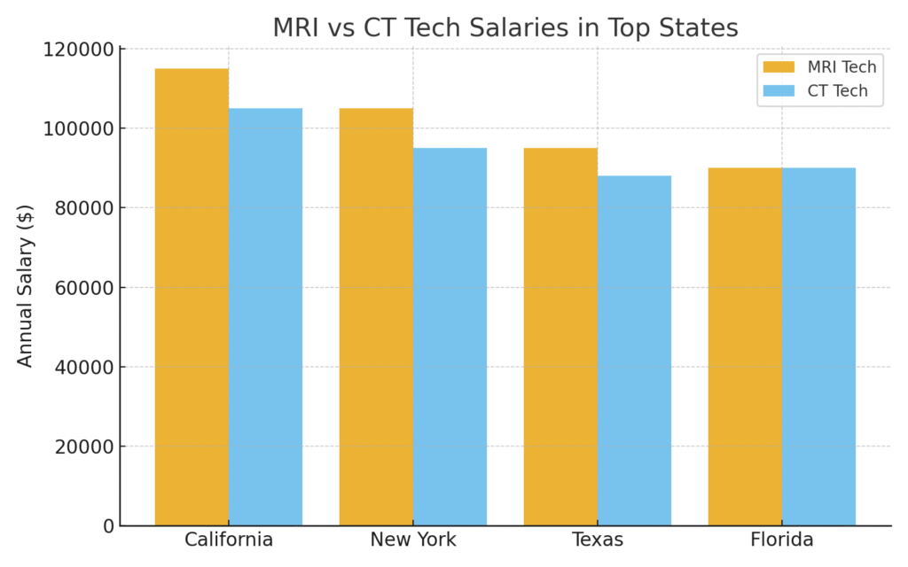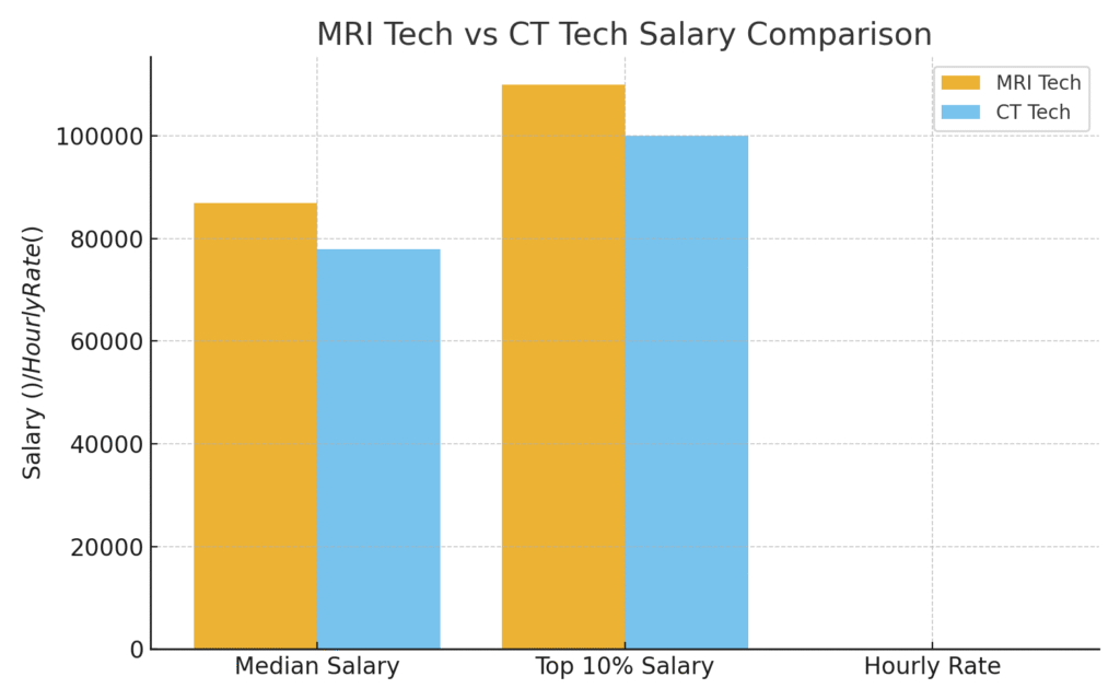 MRI technologists typically earn more than CT technologists. The average MRI tech salary is around $87,000 annually, compared to about $78,000 for CT techs.